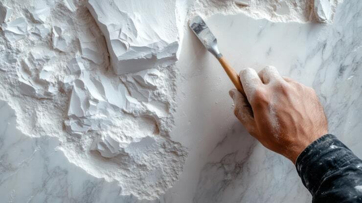 - Формирование рисунка — шпателем или кельмой мастер создаёт прожилки и поры.